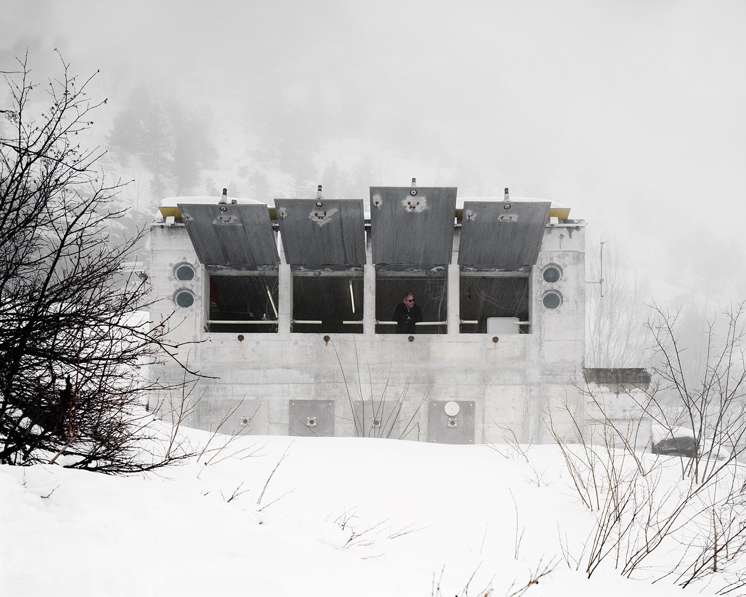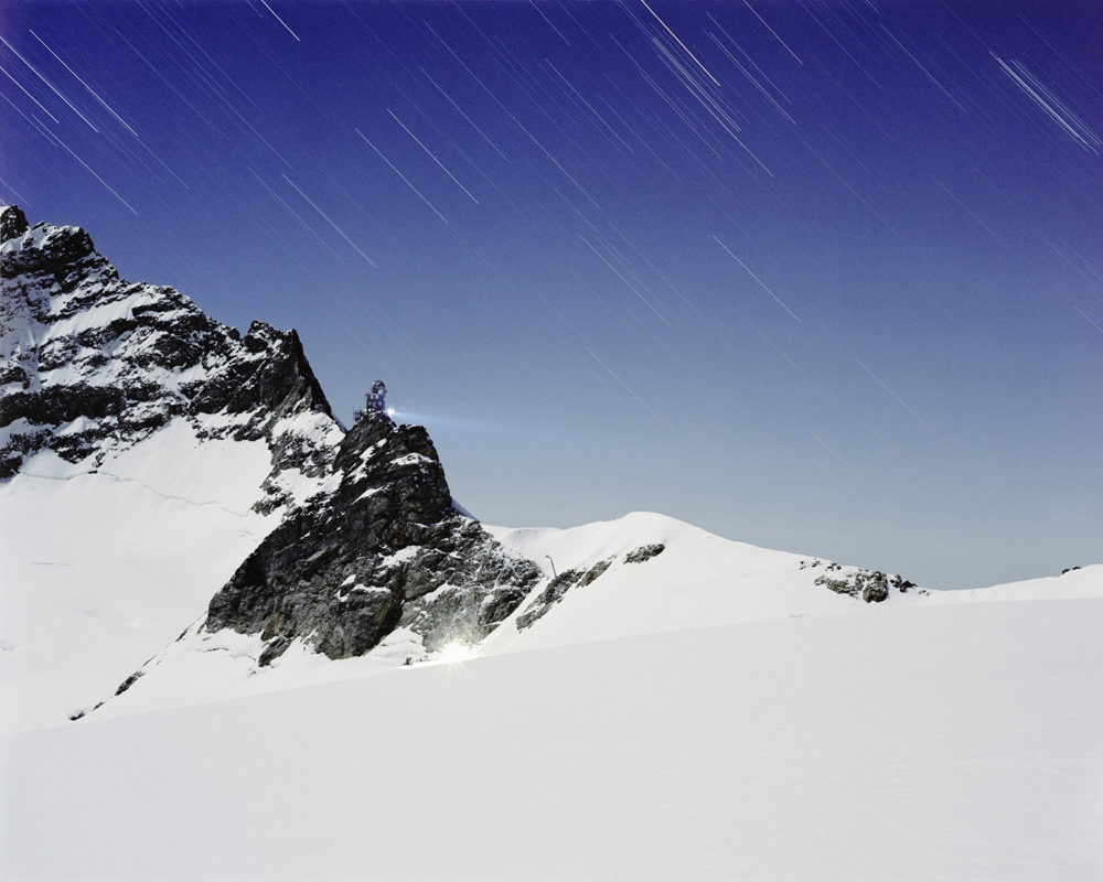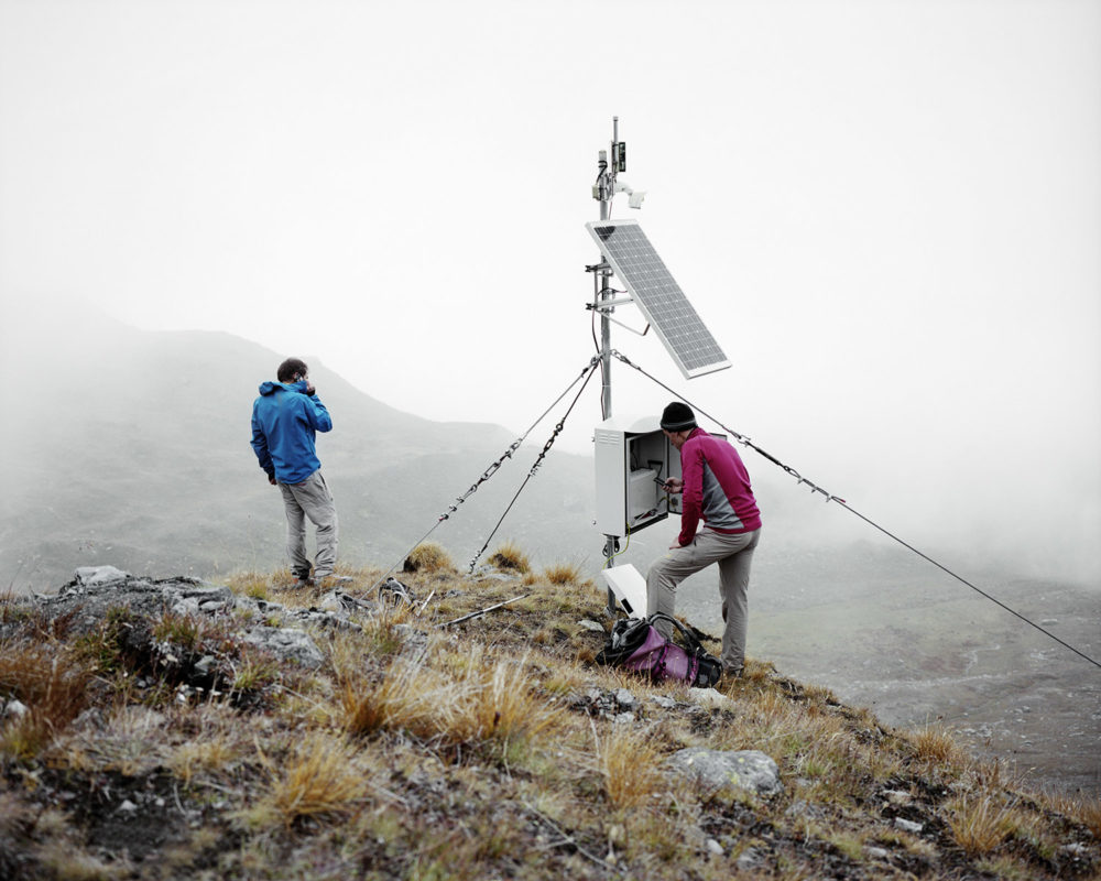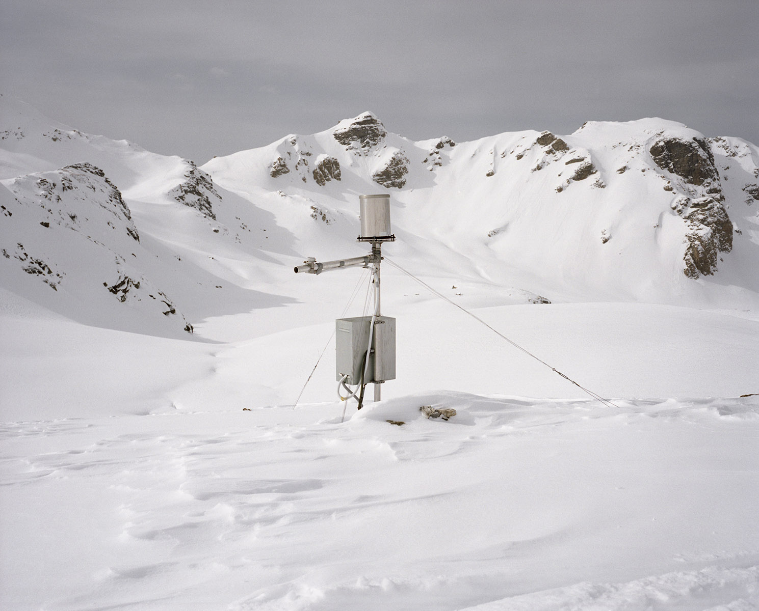 En haute montagne la volonté est verticale, elle est suspendue au câble comme autant de liens nécessaires avec le désir de contrôler, de prendre la mesure. Le béton a la prétention et la fragilité pathétique de celui qui veut tout voir, tout savoir au travers d’un hublot. On a construit des canonnières et des forteresses pour les soustraire au regard. Prométhée est glacial et peut être frigide. Son jet est futile. Lorsque la neige tombe en poussière infime, on sait que dans l’immensité des temps nos vies éparses se ramassent à la balayette comme des miettes et fondent au soleil comme les glaciers. Alors, vite, il faut tout mettre en boîte et ranger les boîtes. Mettre en fiche, remplir des cases, tracer des lignes, des tangentes, obsession de la ligne, de la droite alors que tout invite à la courbe et à la paresse. Il y a chez le scientifique quelque chose du photographe en quête de l’impossible objectif, du sujet qu’on pourrait maîtriser, réduire, résumer. Et vice versa. C’est ainsi que le monde tient dans un IPhone qui dit le temps qui passe et le temps qui fait.