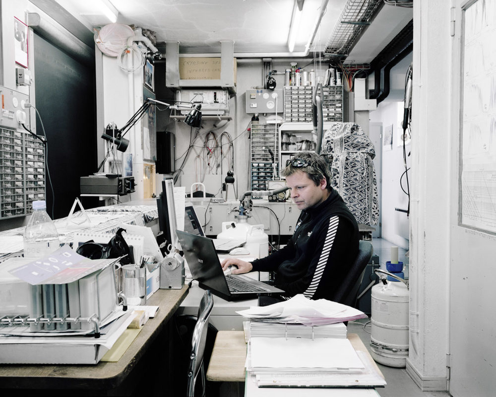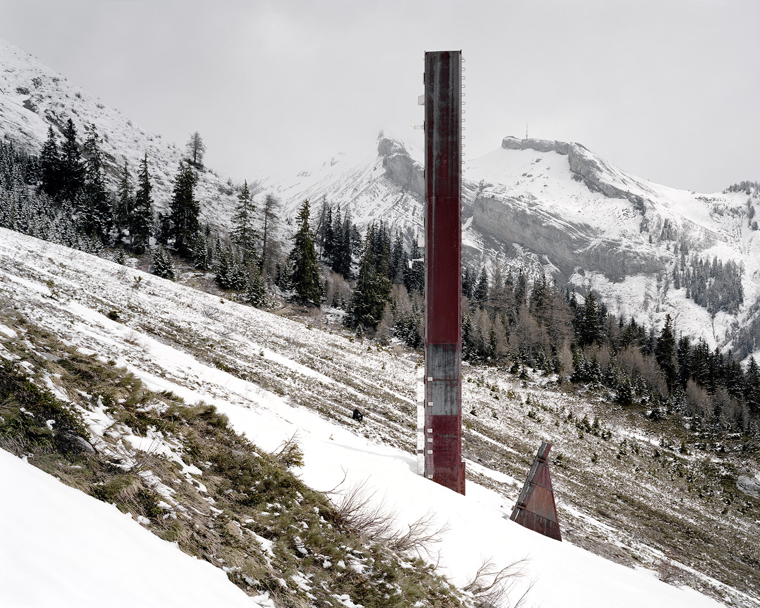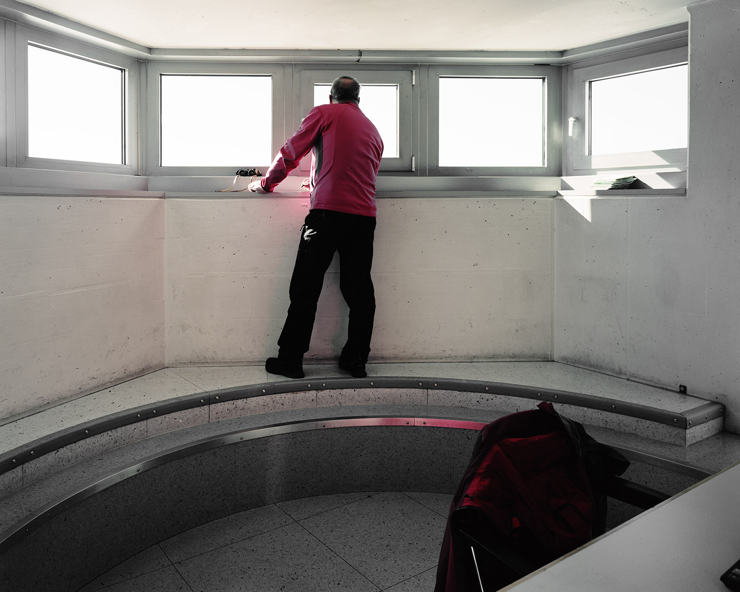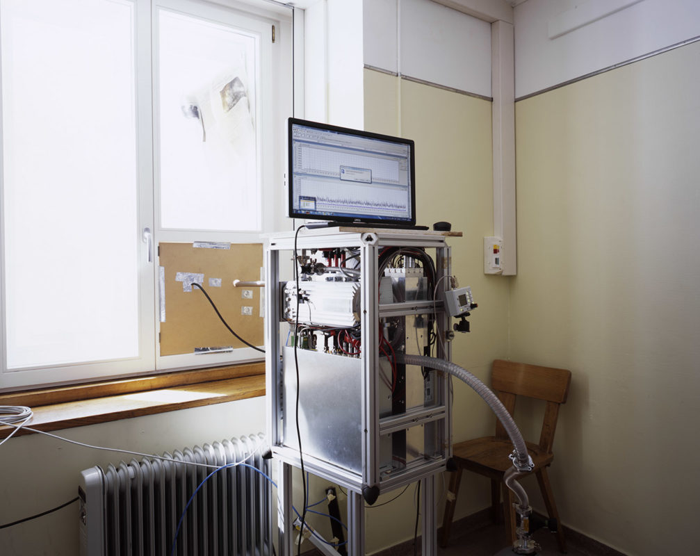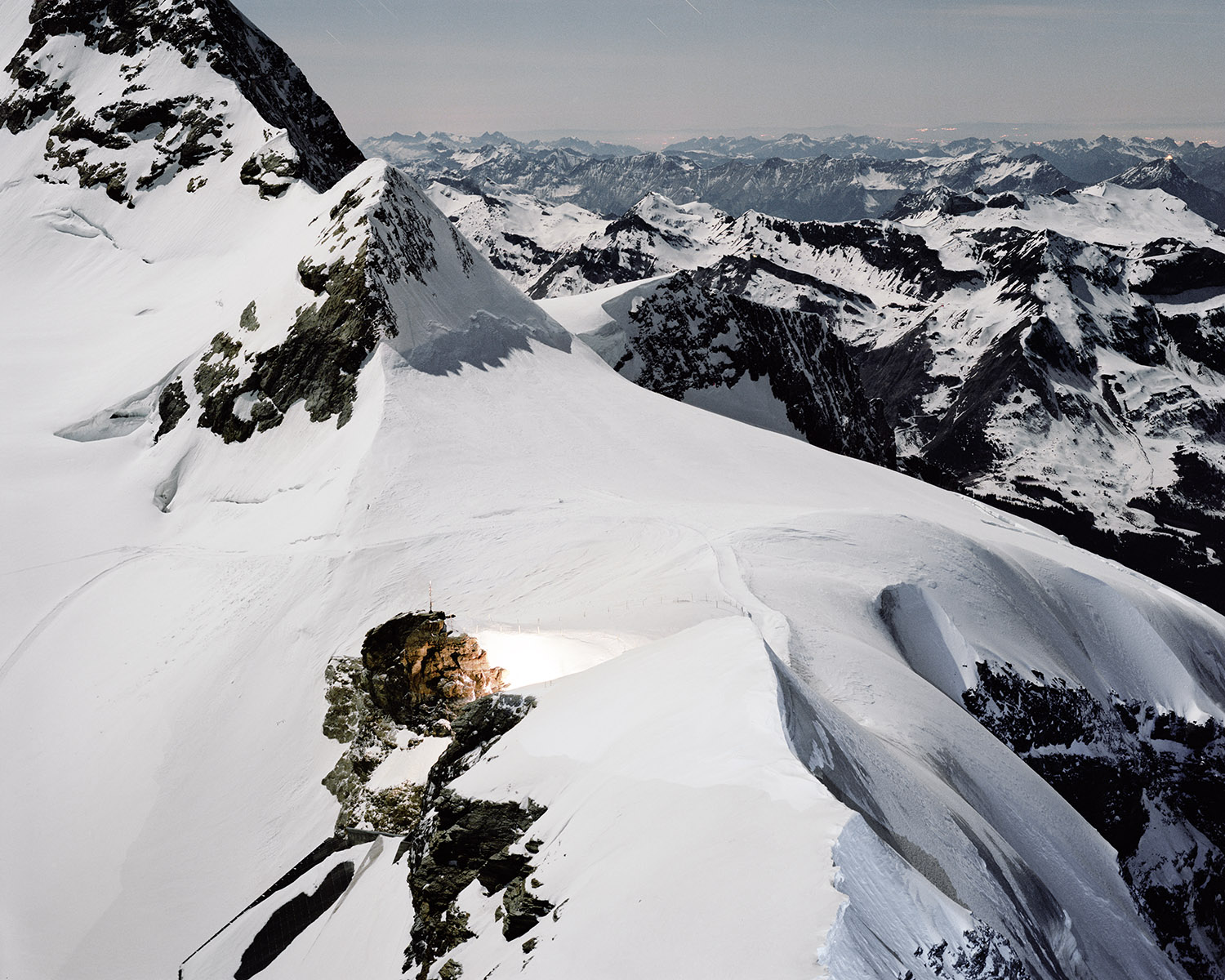 En haute montagne la volonté est verticale, elle est suspendue au câble comme autant de liens nécessaires avec le désir de contrôler, de prendre la mesure. Le béton a la prétention et la fragilité pathétique de celui qui veut tout voir, tout savoir au travers d’un hublot. On a construit des canonnières et des forteresses pour les soustraire au regard. Prométhée est glacial et peut être frigide. Son jet est futile. Lorsque la neige tombe en poussière infime, on sait que dans l’immensité des temps nos vies éparses se ramassent à la balayette comme des miettes et fondent au soleil comme les glaciers. Alors, vite, il faut tout mettre en boîte et ranger les boîtes. Mettre en fiche, remplir des cases, tracer des lignes, des tangentes, obsession de la ligne, de la droite alors que tout invite à la courbe et à la paresse. Il y a chez le scientifique quelque chose du photographe en quête de l’impossible objectif, du sujet qu’on pourrait maîtriser, réduire, résumer. Et vice versa. C’est ainsi que le monde tient dans un IPhone qui dit le temps qui passe et le temps qui fait.