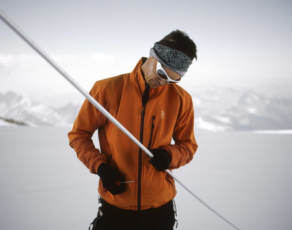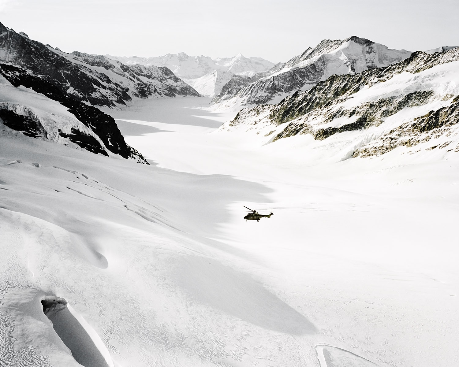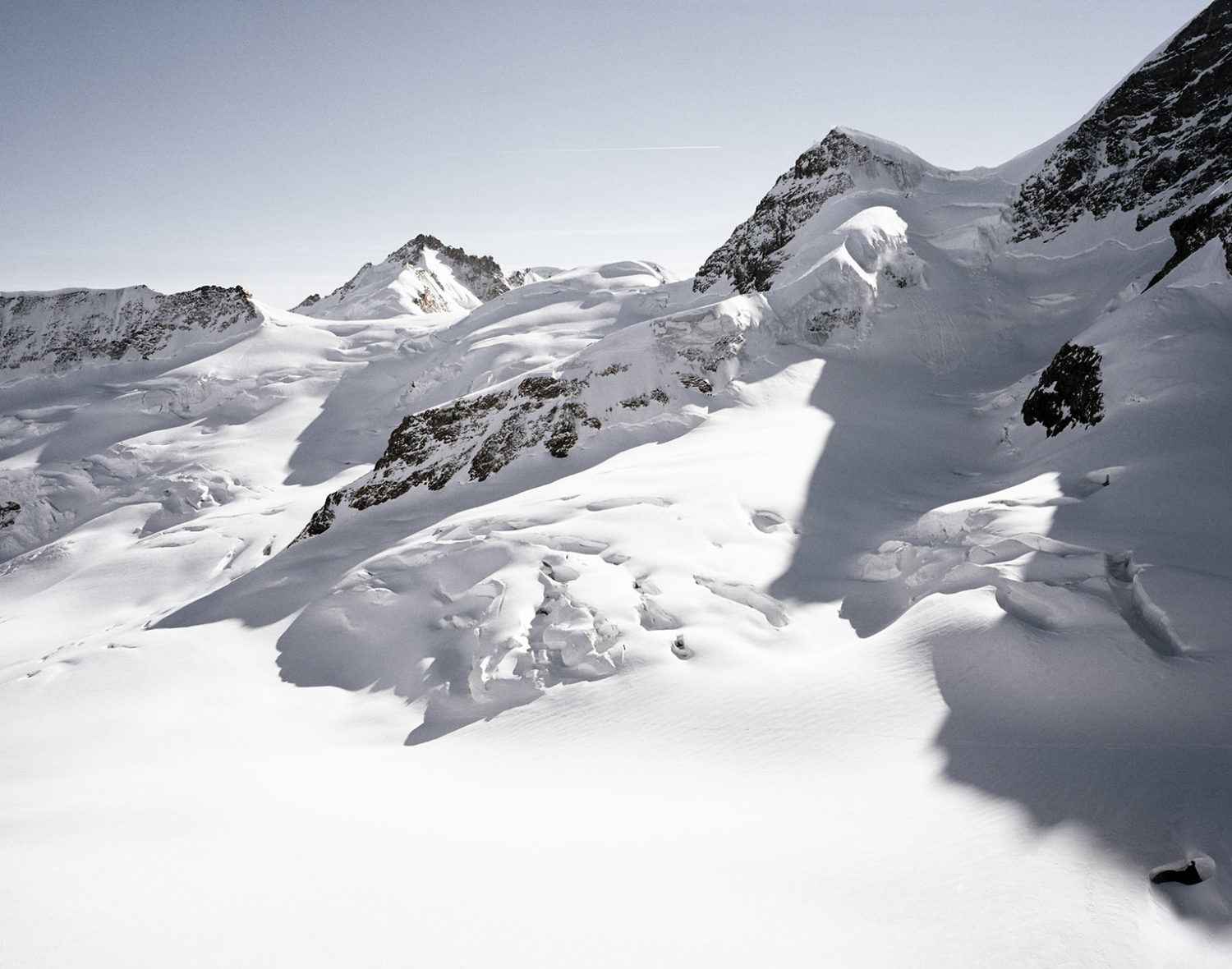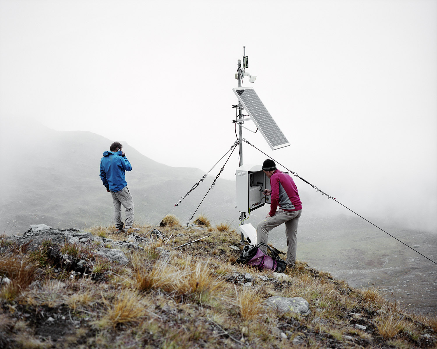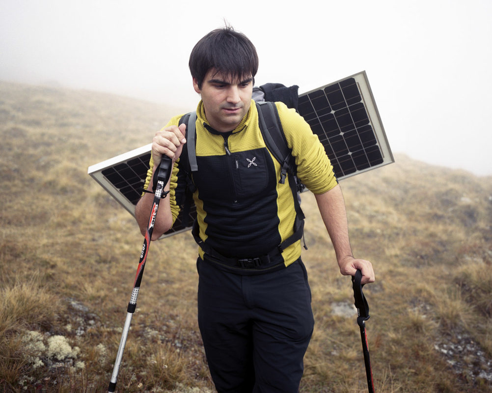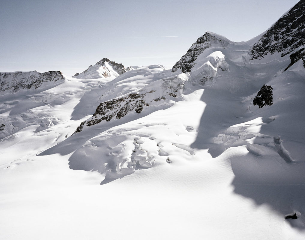 Yannic Bartolozzi s’est lancé le défi de suivre les pèlerins de la technique qui captent le solaire dans un paysage fait pour le brouillard. Les fourrures ont laissé la place au Goretex. L’alpiniste conquérant a sur sa poitrine le X du croisé de la technologie. Il semble égaré dans son ambition de comprendre, perdu dans l’immensité d’une feuille blanche où les hélicoptères se la jouent moustiques.